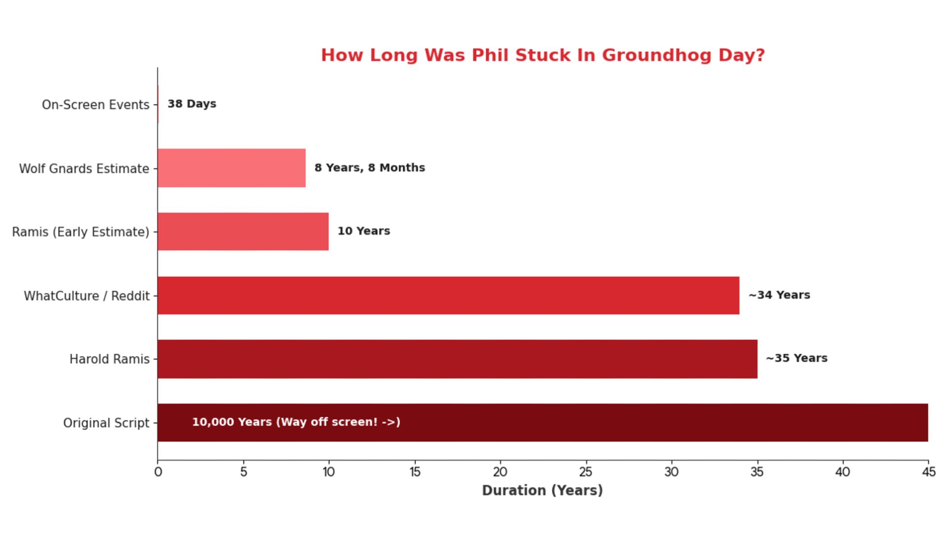 Гарольд Рэмис объяснил, что первоначальная идея для фильма заключалась в том, что Фил проживал один и тот же день около 10 000 лет, прежде чем, наконец, изменить своё поведение. Позже он решил, что 10 лет — более правдоподобный срок. Но преданные фанаты и те, кто хорошо умеет считать, пришли к своим собственным, ещё более подробным расчётам.